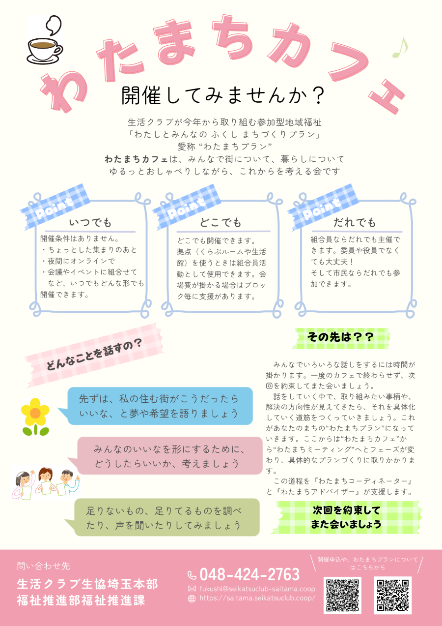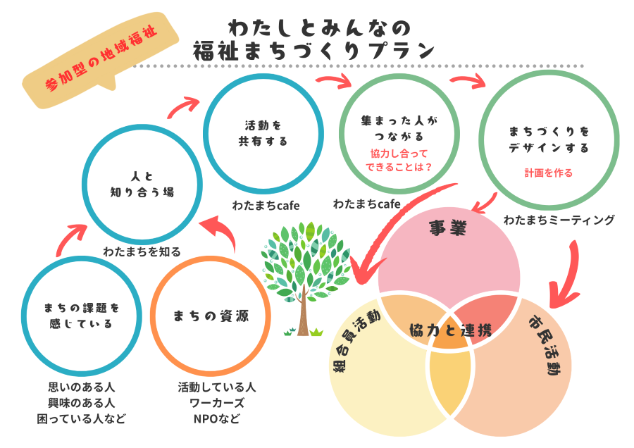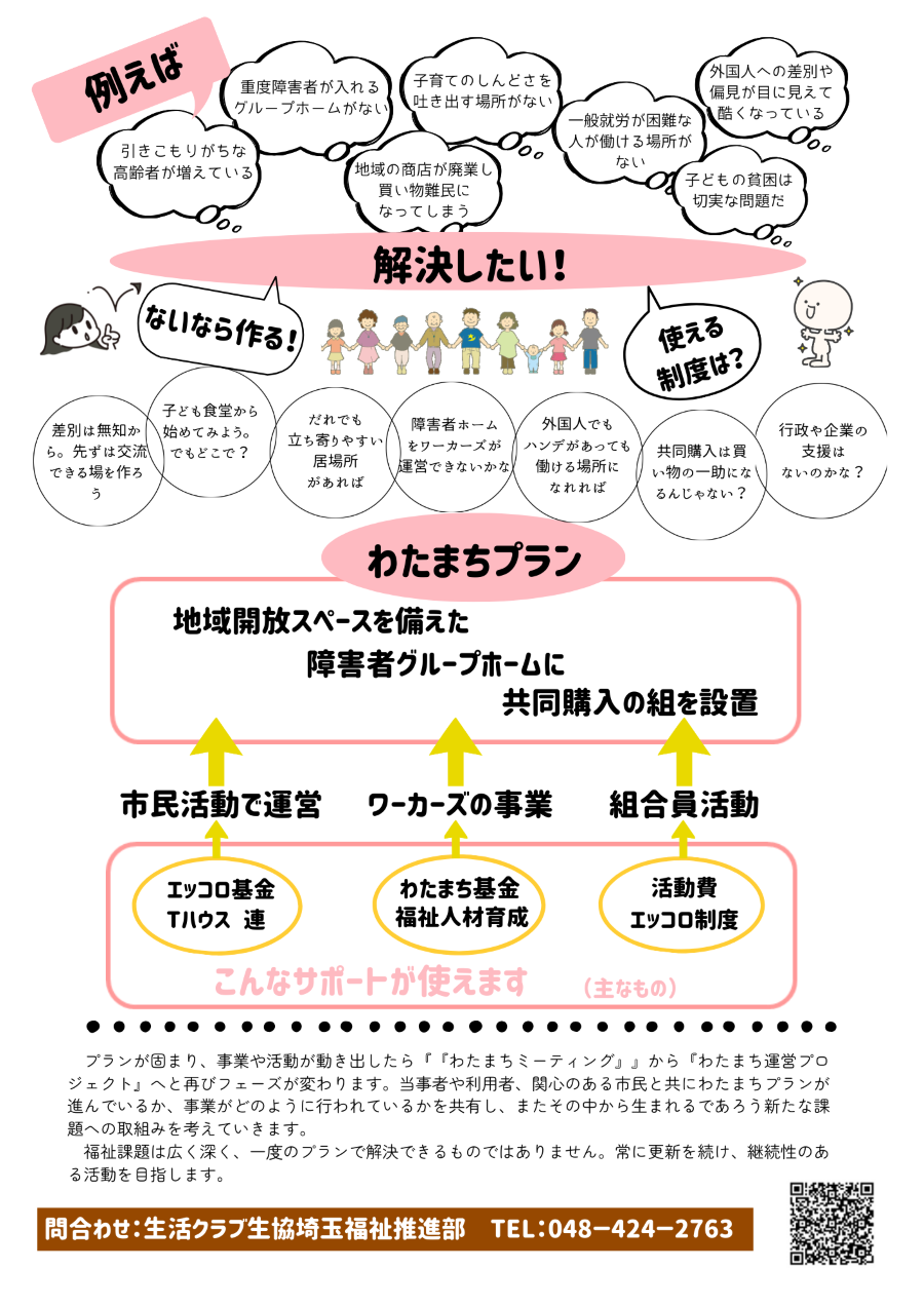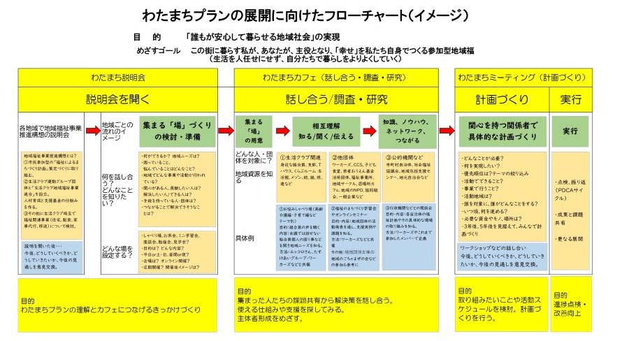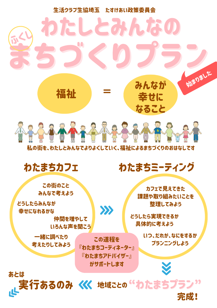 “わたまちプラン”とは、地域の組合員、ワーカーズ、地域住民、福祉団体の人たちなどと一緒に主体的に参加して、自分たちが住む地域で安心して暮らすための「わたしとみんなの福祉まちづくりプラン」。市民参加型の「福祉によるまちづくり」。それが“わたまちプラン”です。