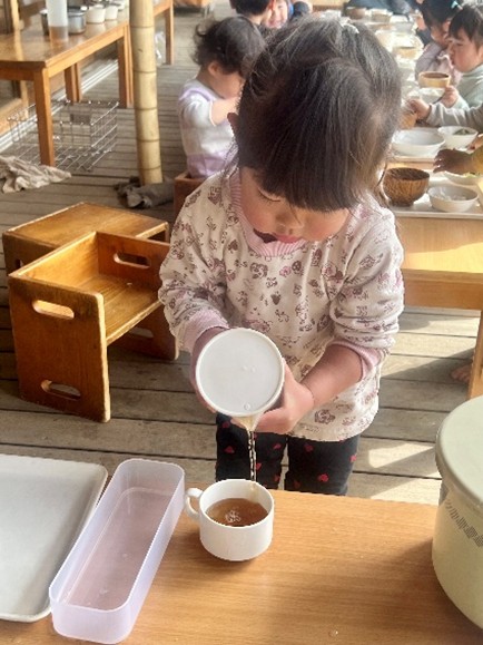 秘伝の「濃厚トリプル出汁」は、昆布+煮干し+パックだし(煮干し・鰹節・昆布・干ししいたけのブレンド)を前日から水出ししたものです。昆布と煮干しでも充分おいしい出汁が出ると思いますが、さらに化学調味料、保存料、食塩不使用で作ったパックだしを追加することで濃厚で深みのある出汁になっています。また、子どもはマヨネーズやクリームシチューなど洋風のものを好みそうですが、「濃厚トリプル出汁」をいつも食べている子どもたちは、ごはんをはじめとして、鯖の味噌煮やほうれん草のおかか和え、切干大根のやわらか煮、里芋の胡麻和え、きんぴら・・・園前で収穫した野菜もふんだんに登場する和食の献立が大好き。特に大好きなお味噌汁はおかわりを3杯する子どもたちがたくさんいました。顧問の大岡先生がご自身の子育て中に実践してきた、添加物や化学調味料をなるべく使わず手作りする身体にやさしいごはん。大人になった息子さんや娘さんは今も毎日の食を大事にしていらっしゃるとのこと。濃厚トリプル出汁を知っているこひつじ園の子どもたちの心と体にもその思いはつながっていくのだと思いました。