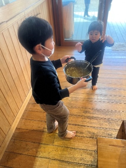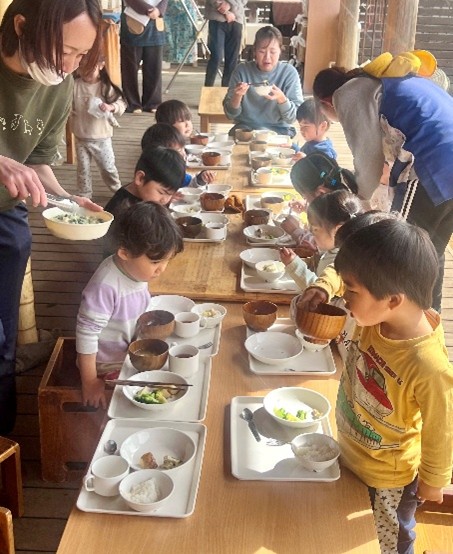 はなぞの保育園は左右にとても広く木がふんだんに使われた園舎で、ドローンで上空から撮影をしないと全貌が見えないくらいです。また、園のまわり360度が自然探検の宝庫。山、谷、川、水、畑や田んぼ…。恵まれた自然と共に子ども達の毎日の暮らしがあります。各教室の前にはスイカやミニトマト、じゃが芋、さつま芋が植えられ、子ども達が水を遣るじょうろが並んでいました。4月はわらびを摘んでわらびごはん。5月は野イチゴを欲しいだけ食べたらジャム作り。6月は梅をもいで梅ジュースと梅干しに。7月はブルーベリーをほおばり、9月は山栗を拾う。10月は柿を食べ、11月は毎日ミカン狩り。12月・1月は冬イチゴの食べ放題。2月・3月はフキノトウを摘んでたらし餅…。自然の中でむきだしになっていく子ども達。給食が食べたくて入園する子がいるほど、毎日の給食が大きな楽しみのひとつになっています。 |