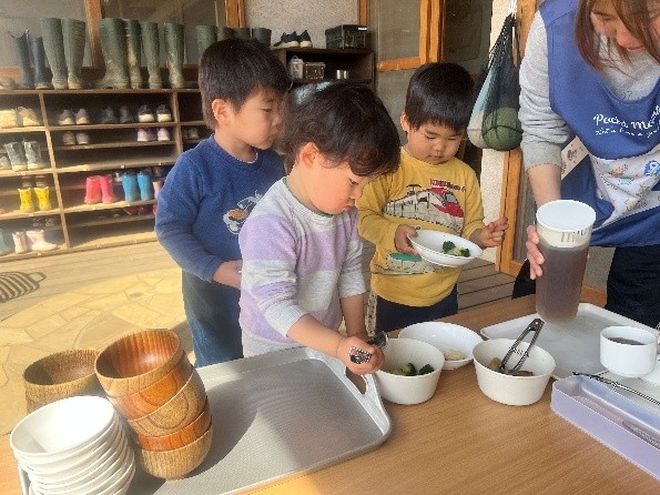 野菜などの素材の味とうまみをいかに引き出すかを工夫しています。じゃが芋やそら豆、たけのこの皮をむいたり洗ったり、煮干しの頭をとるなどこども達がお手伝いをしながら食材に触れる機会をたくさん作っています。近所の農家さんからいただいた、じゃがいも、大根、間引きの人参など新鮮な食材も給食に登場します。