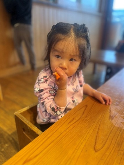 月齢が0~2歳という子どもたちということもあるとは思いますが3人に1人と手厚い先生方の人数だと思いました。隅々まで目が行き届き、みんなが笑顔で明るく楽しい給食の時間が流れていました。苦手なことも無理強いせず「一口たべてみようか」など声がけにも気をつけています。またバナナは厚さ3cmほどにスライスされ手に取りやすいですが、皮には子どもの手でむきやすいように、さりげなく縦に切れめの隠し包丁。器用に小さな指先を使って上手にバナナの皮をむいていました。「自分でできた」は子どもにとってとてもうれしいこと。どうしてもできない時でも投げ出さず「できないからお願い」のやりとりができるそうです。「早く食べなさい」と急かされることがなく、安心してゆっくり味わいながら食事ができる子どもたちは、身体への栄養だけでなく心も豊かになりそうだと思いました。