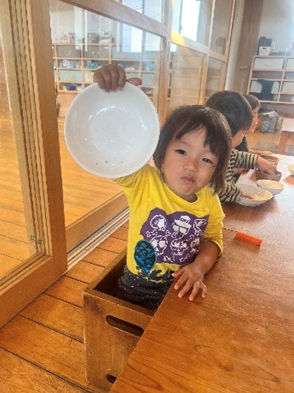 園庭前の広々とした農園では、四季折々たくさんの野菜を作っています。大根・人参・ネギ・さつまいも・里芋・白菜・きゅうり・なす・おくら・トマト・柿や梅など。園庭の目と鼻の先が畑なので、旬の野菜が産地直送!採りたてを味わえます。鮮度抜群の上に、農園の管理をしている大原さゆりさんは、子どもたちに無農薬のお野菜を食べてほしいと土づくりにとてもこだわっており研究熱心です。もれあ保育園の近隣の、武蔵嵐山菅谷館の栗やどんぐりなどの葉、豆腐屋さんのおから、牛糞、わらや木くず、給食で出た野菜の皮などを堆肥にしたものを土に混ぜ込んでいる特別な「大原ブレンド」です。子どもたちに「お野菜好きですか?」と聞いたら「大好き!!!」とみんなから返ってきました。ですから野菜の残食はほとんどありません。取材当日の給食は、茹でて塩を振ったブロッコリーが出ていましたがおかわり続出。0歳・1歳児さんは手づかみ食べで、食事の最初に人参スティックをモリモリ食べていました。素材を活かし、歯ごたえを残した調理に加え、土の力を最大限に引き出した野菜だからこそです。真っ白になったお皿は「ぴっかりん」というそうです。毎日の美味しい給食でお皿はいつも「ぴっかりん」です。