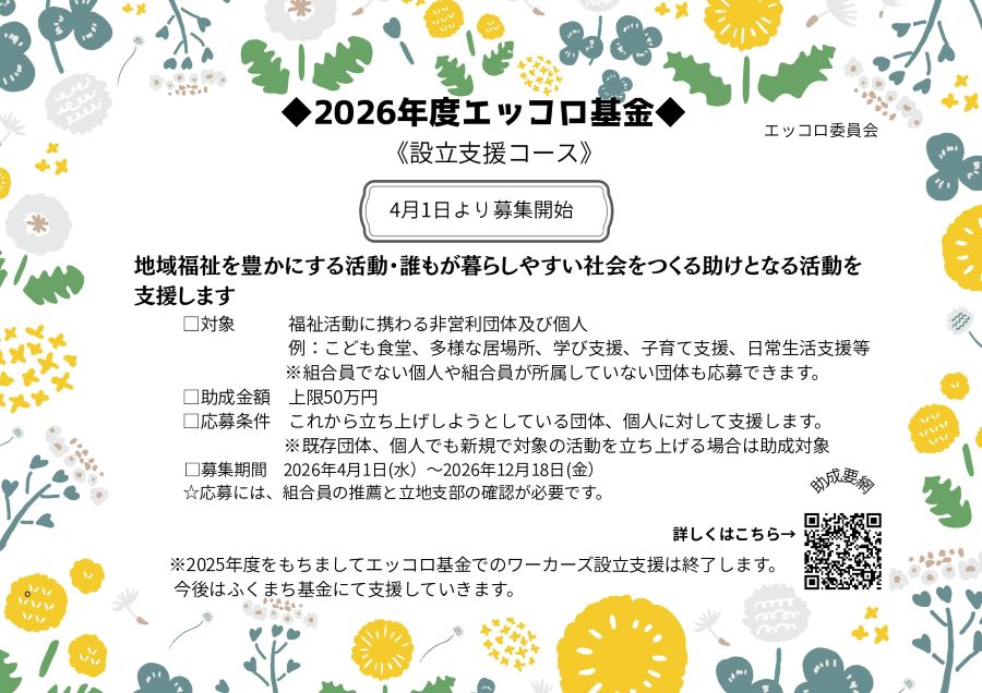 2026年度エッコロ基金助成、設立支援コース:4/1~募集開始、活動支援コース助成団体決定 Tweet 2026年度エッコロ基金助成、 設立支援コース、4/1~募集開始します。活動支援コース助成団体決定しました。 詳しくはこちら ●実施要項 ●申請書 ●推薦書 ●報告書 ♦2026年度エッコロ基金助成①活動支援コース助成団体決定 助成団体一覧はこちら