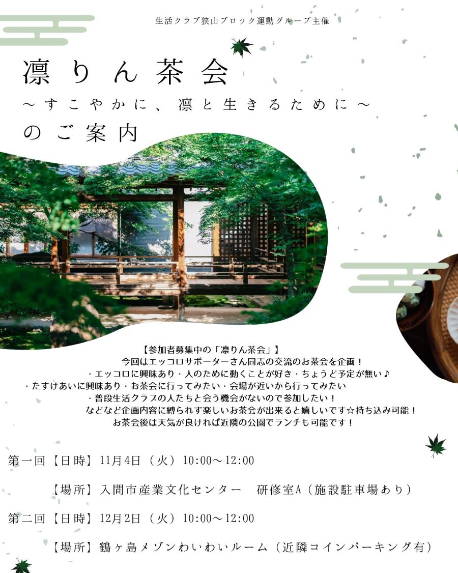 生活クラブ狭山ブロック運動グループが定期開催している「凛りん茶会」のお知らせです🌿