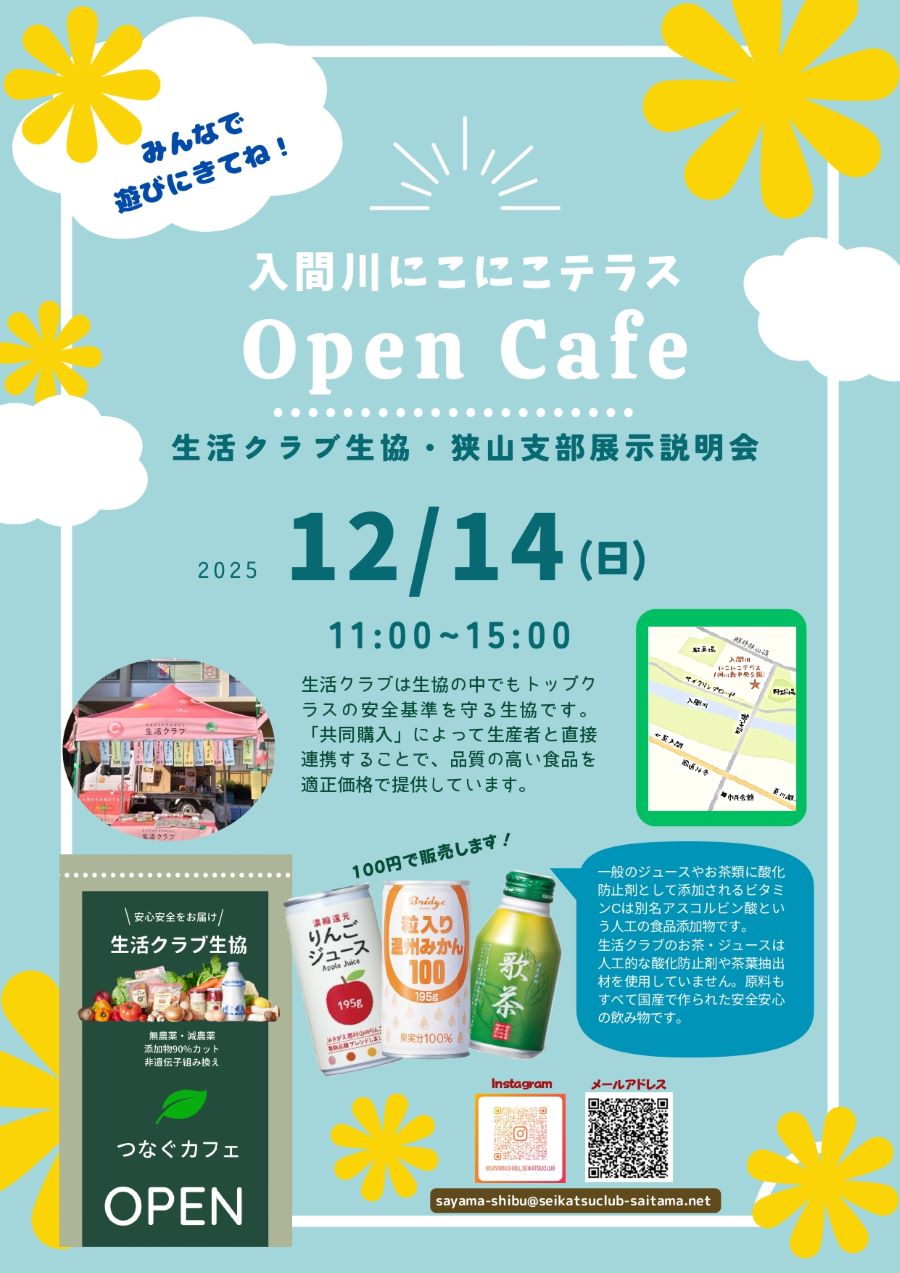 入間川沿いの人気スポット「にこにこテラス」で生活クラブの展説&狭山支部の「つなぐオープンカフェ」を開催します!