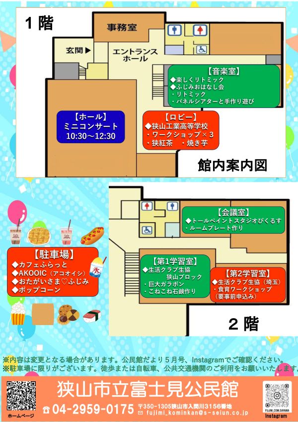 カフェふらっとの韓国料理やかき氷、クッキーなどの出店をはじめ、トールペイント、狭山工業高校による狭紅茶試食や3Dプリンター体験、ミニコンサートなど盛りだくさん。